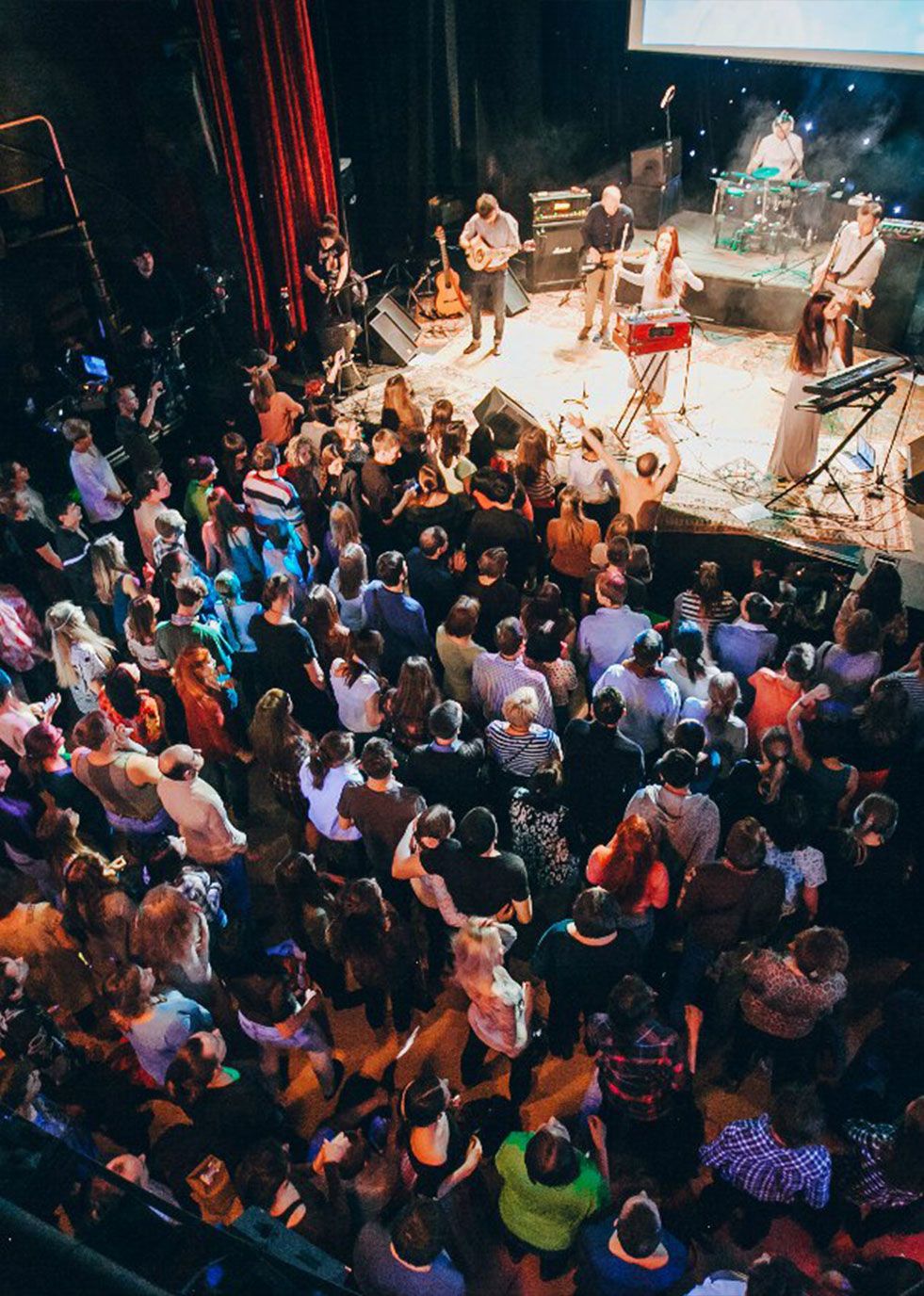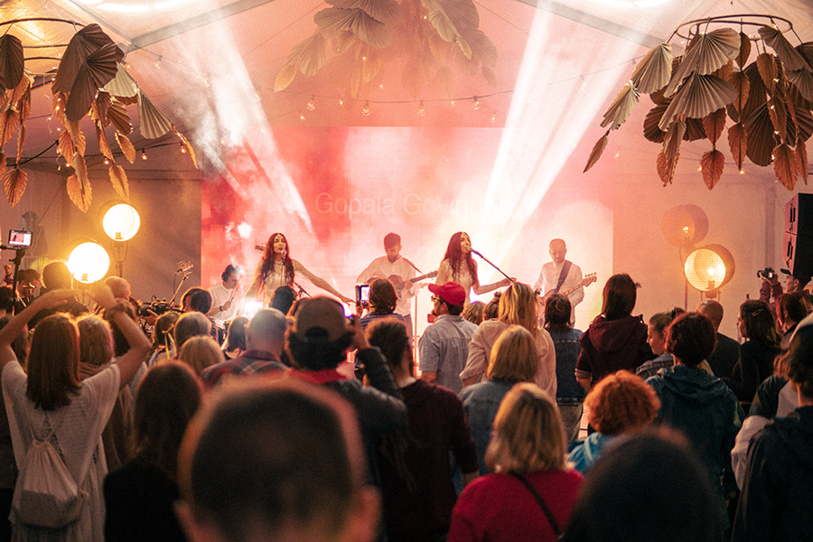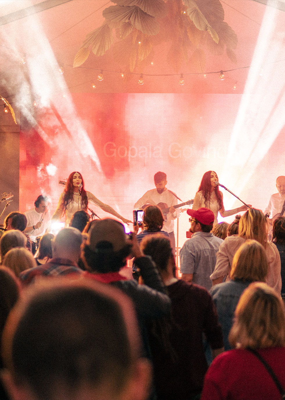 At Kirtan, you can expect a concert with musicians, music, and Mantras instead of